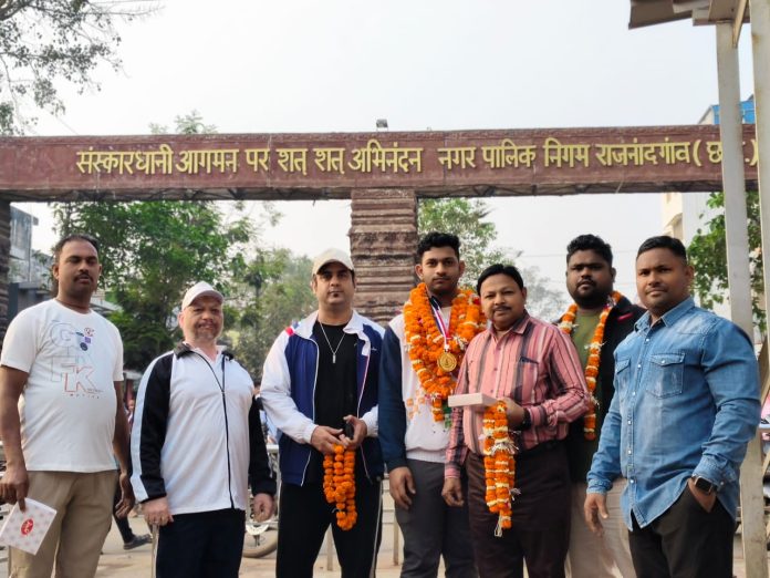 राजनांदगांव:- राष्ट्रीय युथ जूनियर व सिनियर भारोत्तोलन चॉम्पियन शीप स्पर्धा में राजनांदगांव छ.ग.के होनहार वेटलिफ्टर रेहान खान व कु. ज्ञानेश्वरी यादव ने शानदार प्रर्दशन करते हुए सब जूनियर (यूथ वर्ग) में ९४ कि.ग्रा. वजन समुह में स्नेच १२५ कि.ग्रा. क्लिनजर्क १६१ कि.ग्रा. भार उठाते हुए कुल २८६ कि.ग्रा. वजन के साथ गोल्ड मेडल अपने नाम किया वही राजनांदगांव पुलिस विभाग में कार्यरत व इंडिया कैम्प पटियाला में अभ्यासरतकु.ज्ञानेश्वरी यादव ने ५३ कि.ग्रा. वजन समुह में स्नेच, ८३ कि.ग्रा. व क्लिनजर्क १०३ कि.ग्रा. कृुल वजन १८६ कि.ग्रा. वजन उठाकर गोल्ड मेडल अपने नाम की जिला भारोत्तोलन संघ के अध्यक्ष अमीत आजमानी जी से बताया की मोदी नगर में आयोजित राष्ट्रीय स्पर्धा में युथ एवं सिनियर में गोल्ड मेडल लिए उनकी उपलब्धि से न केवल राजनांदगांव जिला बल्कि पूरे छ.ग. प्रदेश का नाम राष्ट्रीय स्तर पर गौरन्वित हुआ है। विषेस उल्लेखनीय है कि इस प्रतियोगिता में छ.ग. को प्राप्त एक मात्र खिलाड़ी स्वर्ण पदक रेहान खान ने जीता और वही कु. ज्ञानेश्वरी यादव ने छ.ग. पुलिस टीम से प्रतिनिधित्व करते हुए अपने वजन गु्रप में गोल्ड मेडल हासिल की जिससे प्रदेश का खेल का गौरव और अधिक सुदृढ़ हुआ उनकी सफलता,कठिन परिश्रम,अनुशासन और दृढ़ संकल्प का परिणाम है। जिससे प्रदेश के युवा एंव युवती खिलाडिय़ों में नया उत्साह भर दिया है।आजमानी जी ने बताया कि स्वर्ण पदक जीतने के पश्चात् रेहान खान के राजनांदगांव आगमन पर रेल्वे स्टेशन में जिला भारोत्तोलन संघ एंव जय भवानी व्यायाम शाला द्वारा उनकी भव्य स्वागत हार माला बाजे-गाजे के साथ मिठाई खिलाकर उनका भव्य स्वागत किया गया, और उनके उज्जवल भविष्य की कामना किया गया। इस स्वागत के शुभ अवसर पर जिला भारोत्तोलन संघ एवं जय भवानी व्यायाम शाला के पदाधिकारी एवं सदस्य अध्यक्ष अमीत आजमानी संरक्षक डोमन महोबिया,अजय श्रीवास्तव, सचिव अशोक श्रीवास, नारायण लोहार, तामेश्वर बंजारे, मजहर खान, संघ एवं व्यायाम शाला के पदाधिकारी एवं सदस्य व गणमान्य नागरिक उपस्थित थे। और उनकी उज्जवल भविष्य की कामना की गई।और इन खिलाडिय़ों के उपलब्धि पर सफलता पर जिला भारोत्तोलन के संरक्षक डोमन महोबिया, अजय श्रीवास्तव, नीलू शर्मा, जीतू मुदलियार , अध्यक्ष अमित अजमानी, सचिव अशोक श्रीवास, कोषाध्यक्ष बंसत मैगी, व्यायाम शाला के सचिव शेख वशीम, सहसचिव निरज शुक्ला, उपाध्यक्ष विवेक रंजना सोनी, शंशाक तिवारी, दीपक ठाकुर मजोज यादव, चोवाराम सोनकर, नाहिद अख्तर, अंकुश अजमानी, आकाश सोनी, नरायण लोहार, तामेश्वर बंजारे, अभिशेक अजमानी, रितेश घरड़े, व्यायाम शाला के वरिष्ठ सदस्य दाउद खान, अजय कुलदीप, रामा यादव, जग्गु ठाकुर, नितिन शर्मा, रवि गुप्ता, गणेश साहू, स