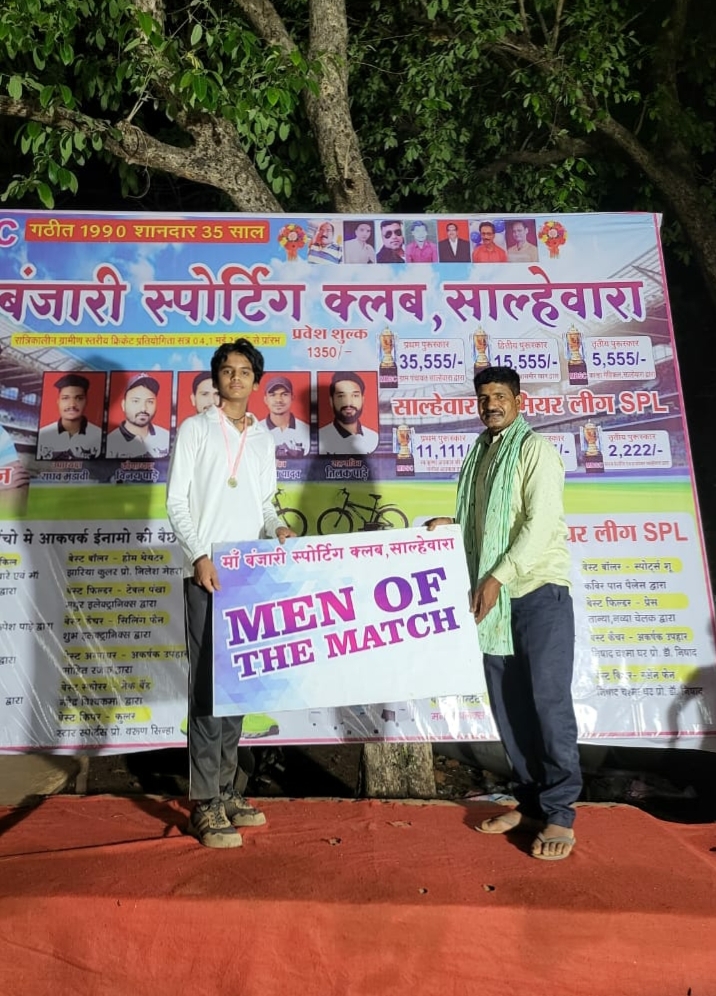 वनांचल साल्हेवारा में आयोजित मां बंजारी स्पोर्टिंग क्लब क्रिकेट समिति (35 वर्ष पूर्व का नामकरण )के तत्वावधान में आयोजित रात्रिकालीन फ्लड लाइट टेनिस बाल क्रिकेट प्रतियोगिता में अपनी टीम की ओर से बेहतर प्रदर्शन का मैन ऑफ द मैच का पुरुस्कार साल्हेवारा के समीपस्थ ग्राम पंचायत भाजिडोंगरी के ग्राम प्रमुख धुरवा राम खुसरो से प्राप्त करते हरफनमौला क्रिकेट खिलाड़ी हिमांशु शुक्ला।